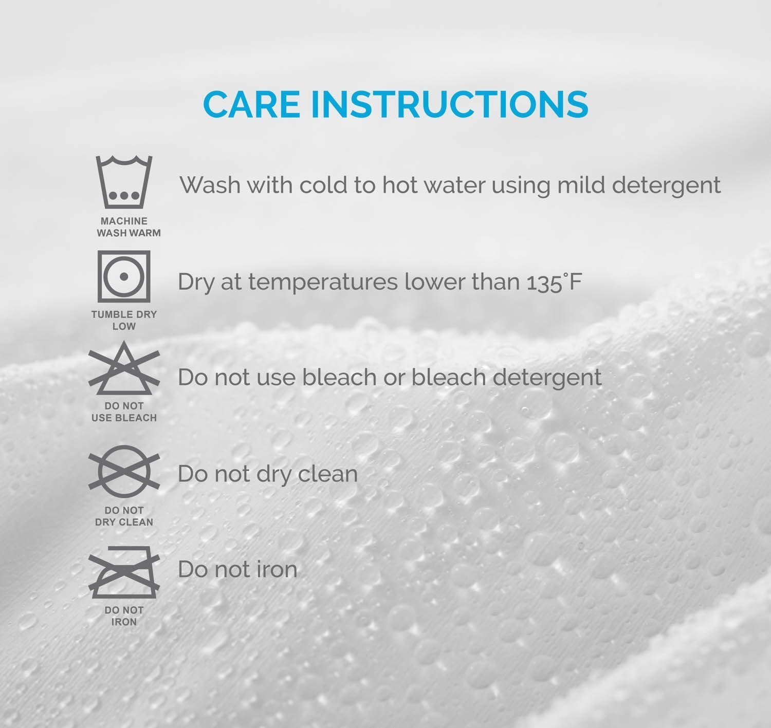 • Peace of Mind: BABY – Water Proof Mattress Fitted Sheet Keeps your mattress protected. Its advanced covering provides protection from stains, spills, moisture including incontinence and sweat. Its water proofing from the inside is adequate to protect the mattress and the outer side gives a fabric feel. This complete fit sheet spreads on the mattress at ease providing you all the comfort and style. Ideal for use with infants and elderly patients.Easy to wash.Use a front load washing machine(not with blades).Use mild detergent.Wash only this product separately .Dry with inside laminated.Frequent washing of the product will keep the product free from dust,mites,allergens.