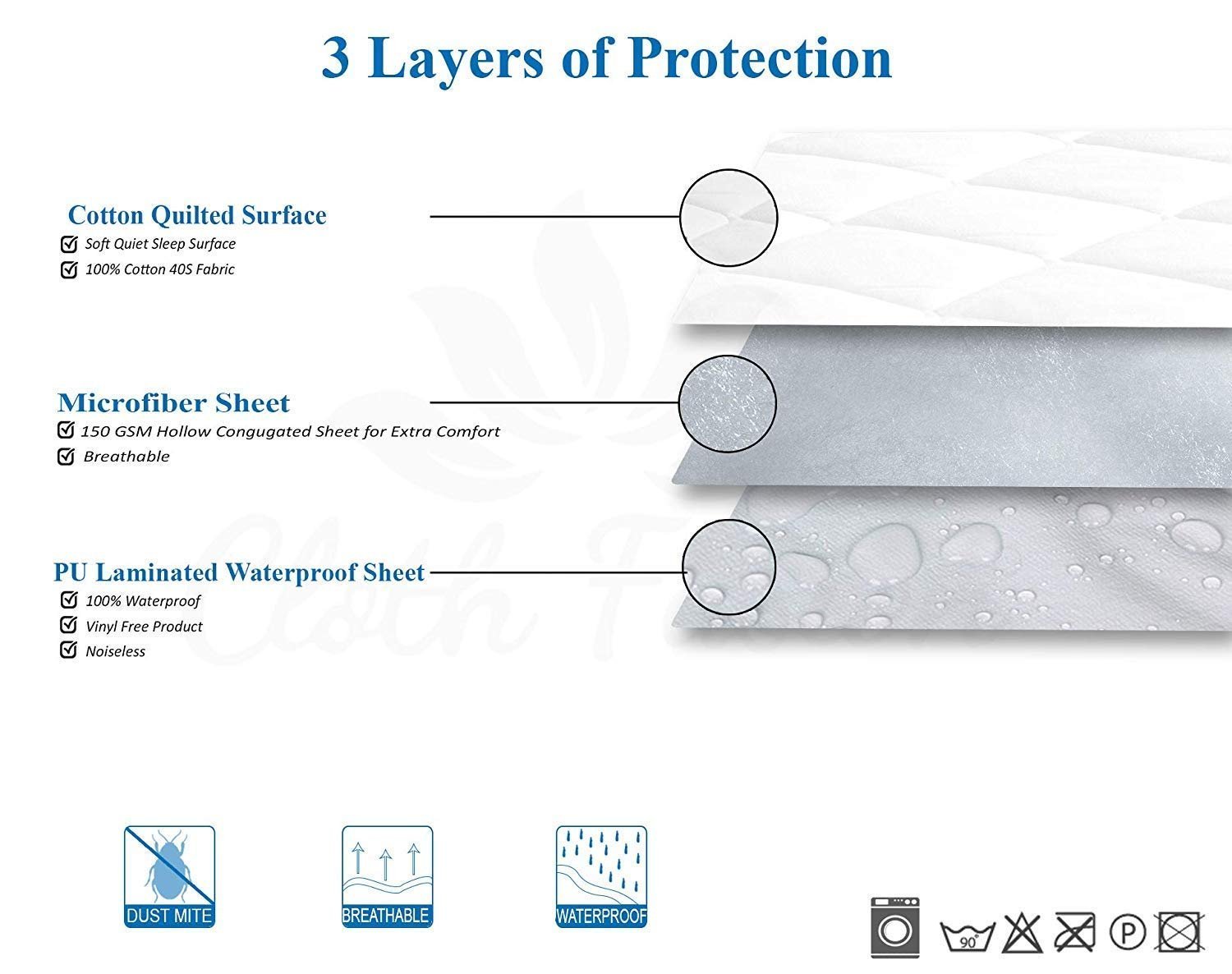 Soft cotton surface – breathable, cool and noiseless To keep our protectors cool and noiseless, the surface material is made with soft 100% cotton 30s.